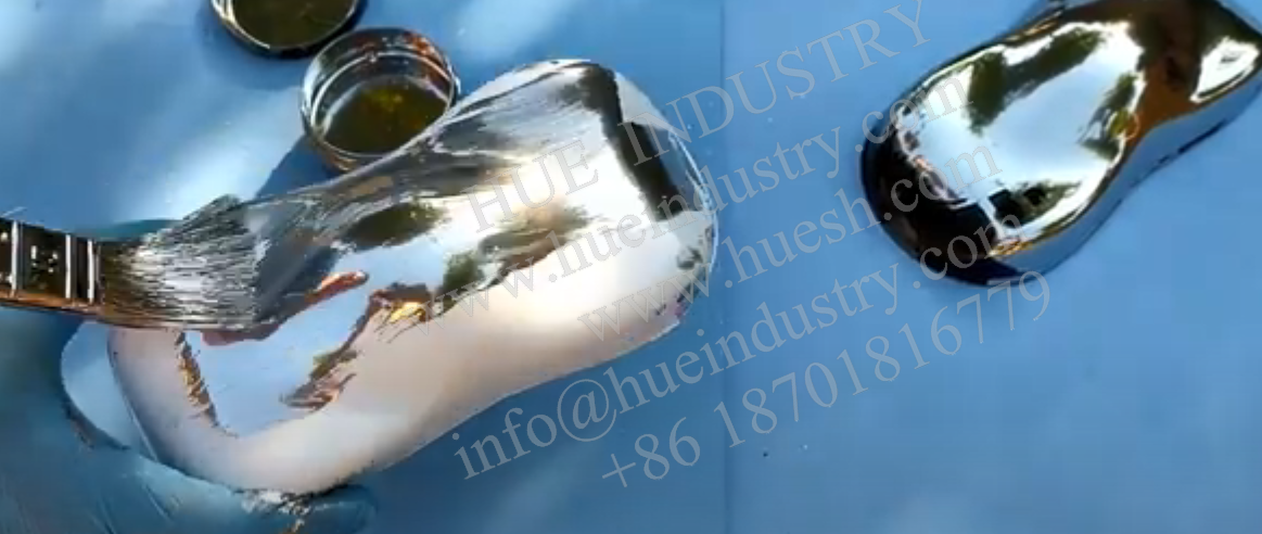 喷涂使用镀铬漆D215时,通常选择两遍法,第一遍枪距大于20cm类似干喷法,不求彻底遮盖,相当于用D215干喷法打底,间隔5-10分钟后湿喷第二遍,枪距小于20cm,肉眼可见完美镜面效果后收工即可。